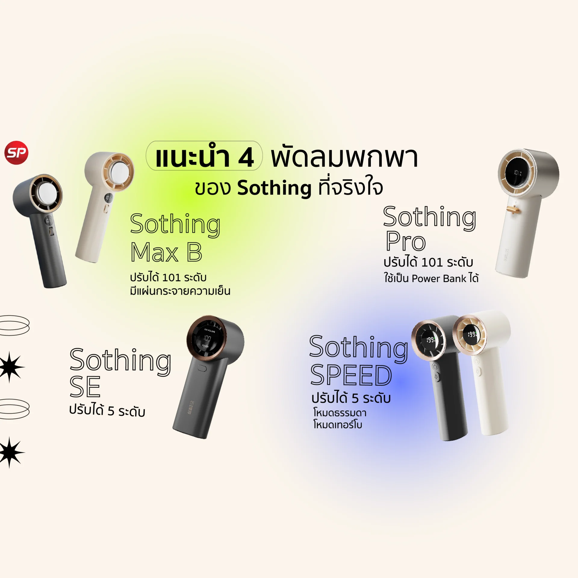 พัดลมพกพาของแบรนด์ Sothing ทั้ง 4 รุ่นนี้มีคุณสมบัติและความสามารถที่แตกต่างกันไปตามความต้องการของผู้ใช้งาน ไม่ว่าจะเป็นรุ่น SE ที่เน้นความเรียบง่าย รุ่น Pro ที่เน้นประสิทธิภาพ รุ่น Speed ที่เน้นความเร็ว และรุ่น Max B ที่มีฟังก์ชันครบครันและแผ่นกระจายความเย็นทำจากโลหะ ทุกๆ รุ่นของ Sothing ได้รับการออกแบบมาเพื่อให้ตอบสนองต่อความต้องการที่หลากหลายของผู้ใช้งานและให้ความเย็นสบายในทุกๆ สถานการณ์