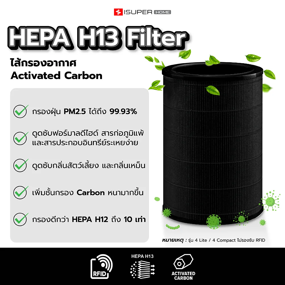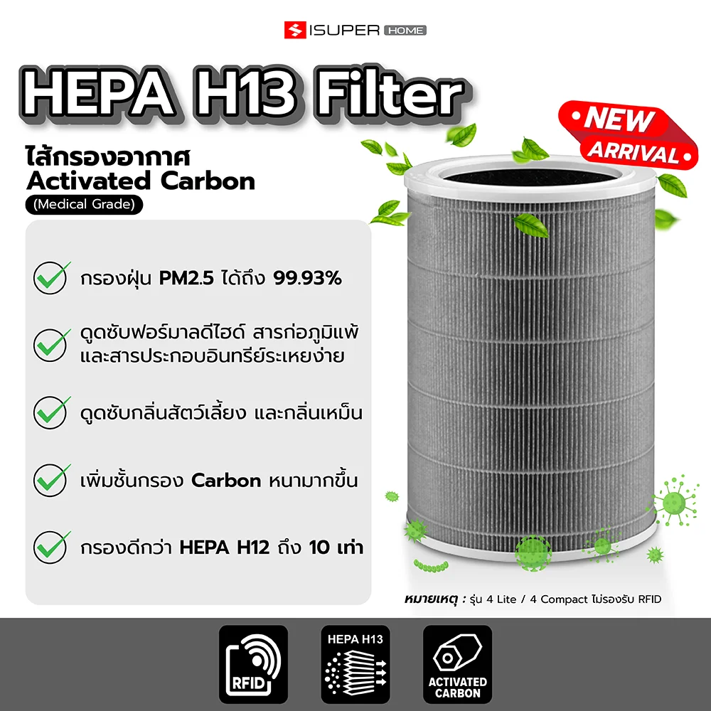 - กรองได้เหนือกว่าด้วยชั้นกรองวัสดุ HEPA H13 (High Efficiency Particulate Air Filter) ซึ่งกรองได้เหนือกว่าไส้กรองทั่วไป