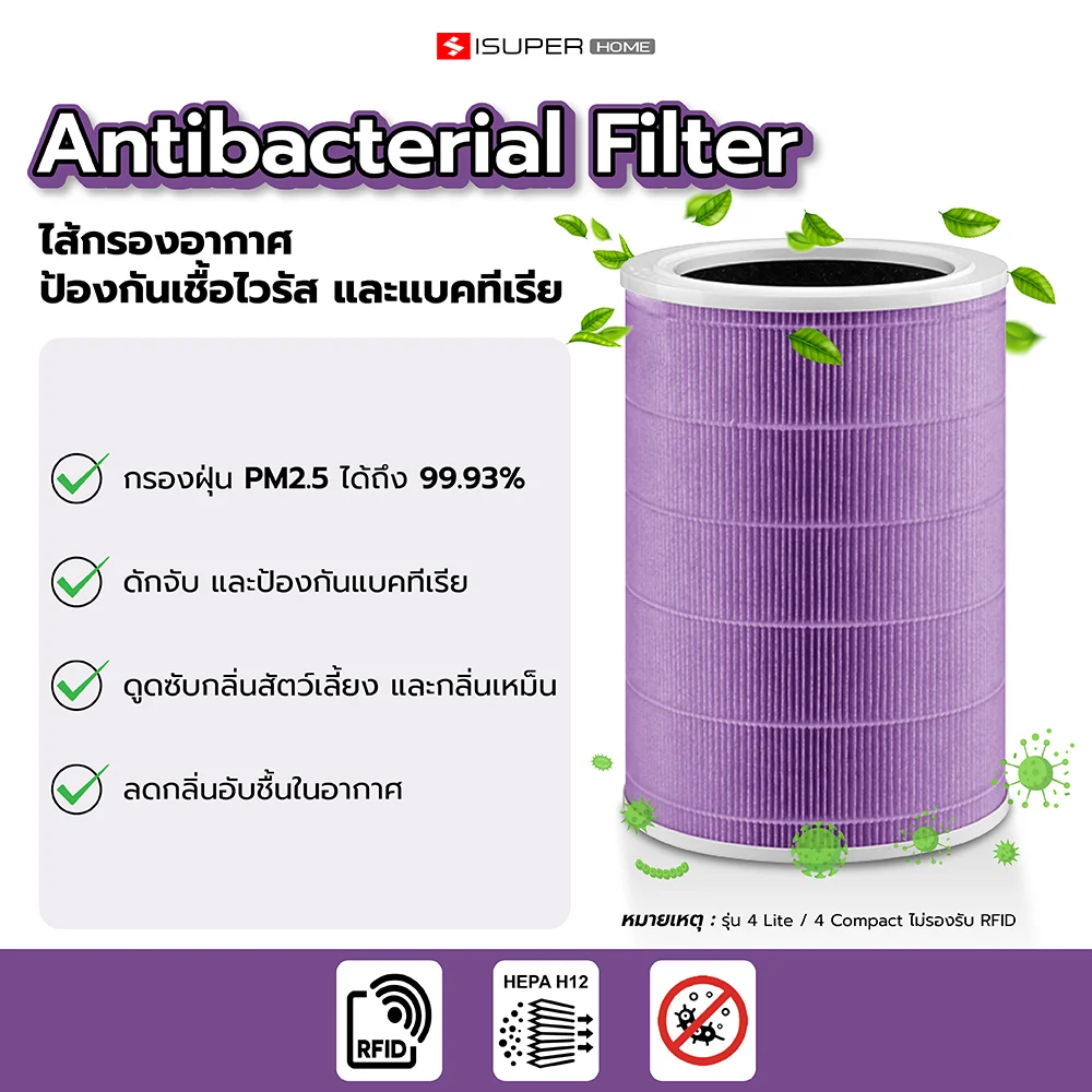 4.) สีม่วง Antibacteria Filter สำหรับเครื่องฟอกอากาศ Xiaomi รุ่น 2S,2H,3H,Pro,2C,3C,Smartmi,4 Lite,4 Compact