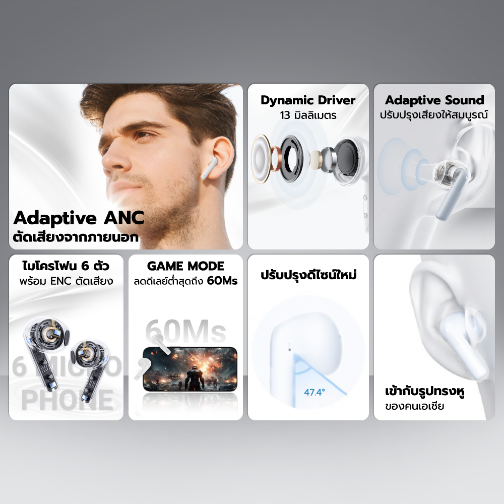 - เงียบกว่าเดิม ด้วยเทคโนโลยีตัดเสียงรบกวนรอบข้าง Adaptive ANC