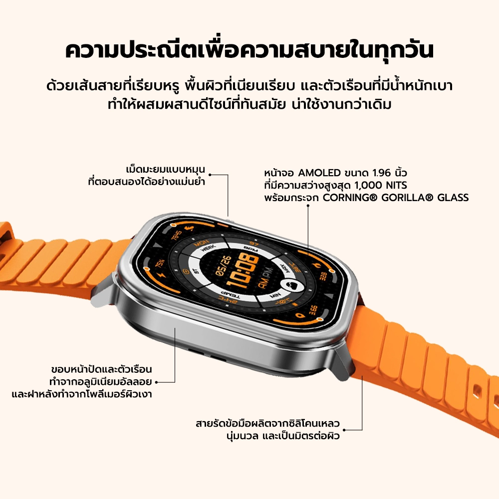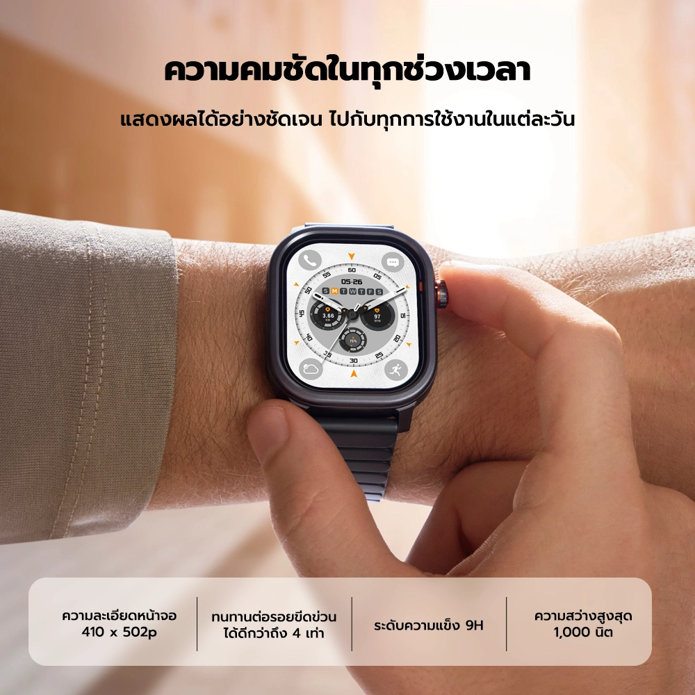 - หน้าจอ AMOLED ขนาด 1.96 นิ้ว มีความสว่างสูงสุด 1,000 Nits