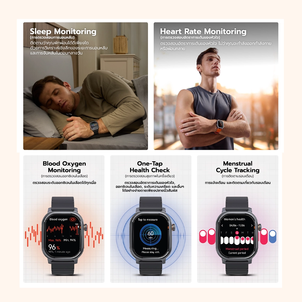 - ตรวจวัดสุขภาพทุกช่วงเวลา ไม่ว่าจะทำงาน พักผ่อน หรือออกกำลังกาย