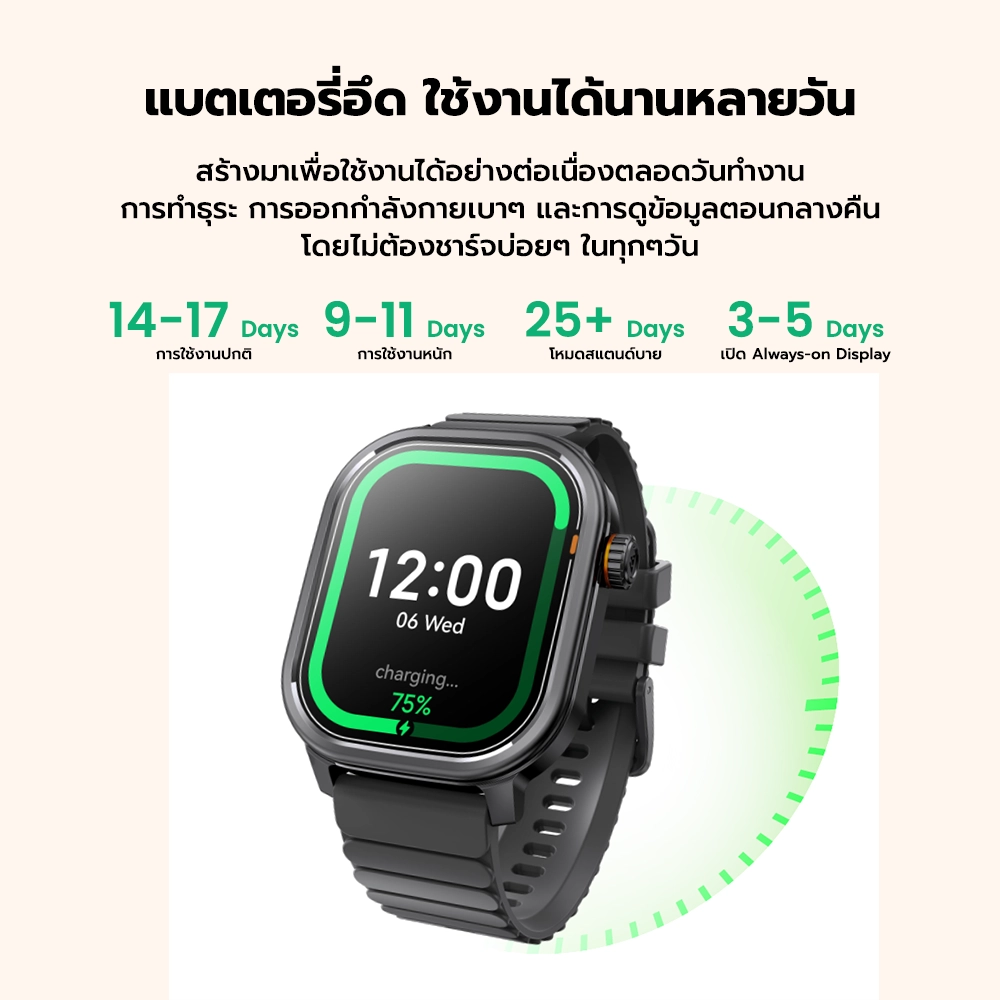 * 14 - 17 วัน สำหรับการใช้งานปกติ (การแจ้งเตือนน้อย ไม่ออกกำลังกาย)