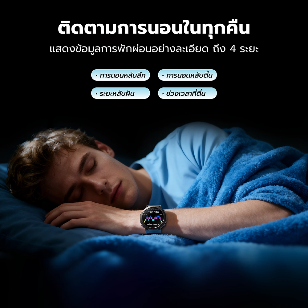 - ดูแลคุณแม้จะนอนหลับ ด้วยการติดตามการนอนหลับในทุกคืนถึง 4 ระยะ