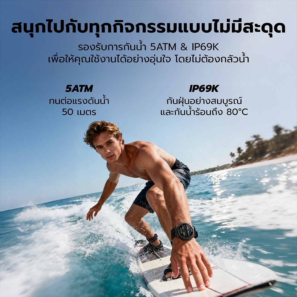 * 5ATM เป็นระดับการทนต่อแรงดันน้ำ เทียบเท่ากับความลึก 50 เมตร