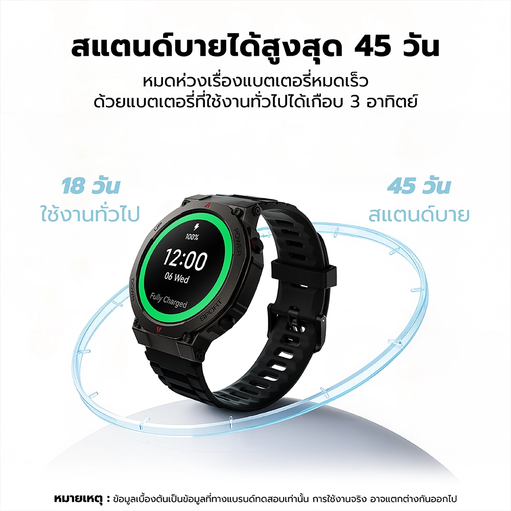 - สแตนด์บายได้นานสุดถึง 45 วัน หมดห่วงเรื่องแบตเตอรี่นาฬิกาหมดไว