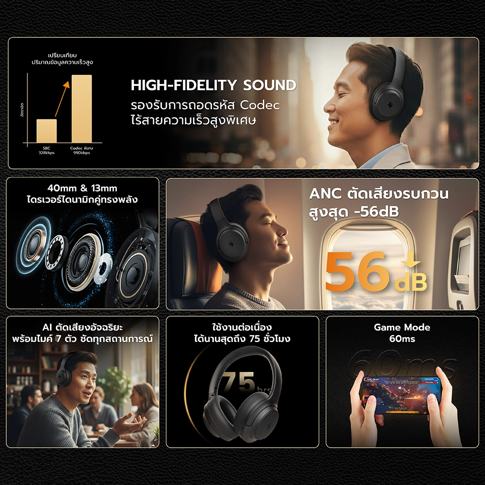 - ดื่มด่ำกับความเงียบ ด้วย ANC ที่สามารถตัดเสียงรบกวนได้ถึง -56dB