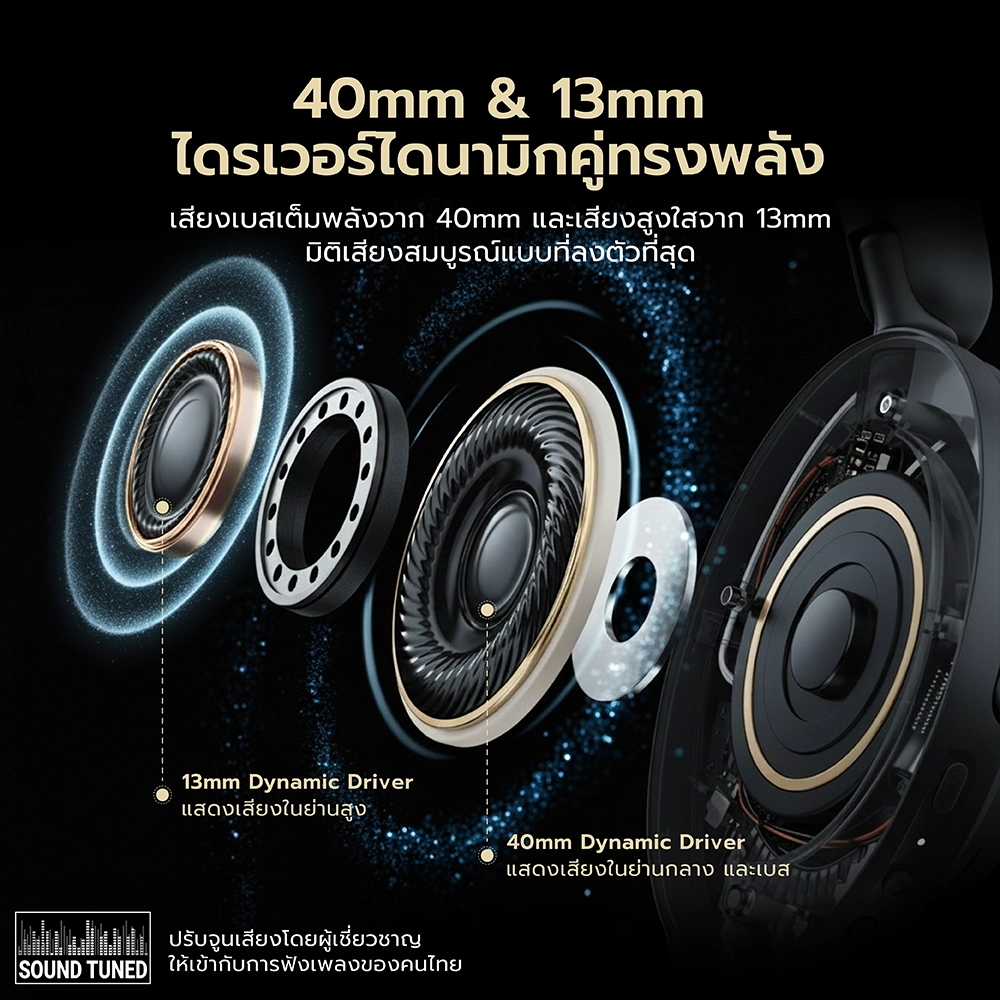 * Dynamic Driver 40mm แสดงเสียงย่านกลาง และเสียงเบส