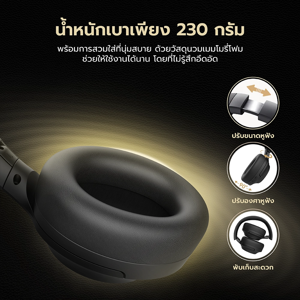 * วัสดุนวมผลิตจากเมมโมรี่โฟม พร้อมปรับขนาดหูฟังให้เข้ากับผู้สวมใส่ได้